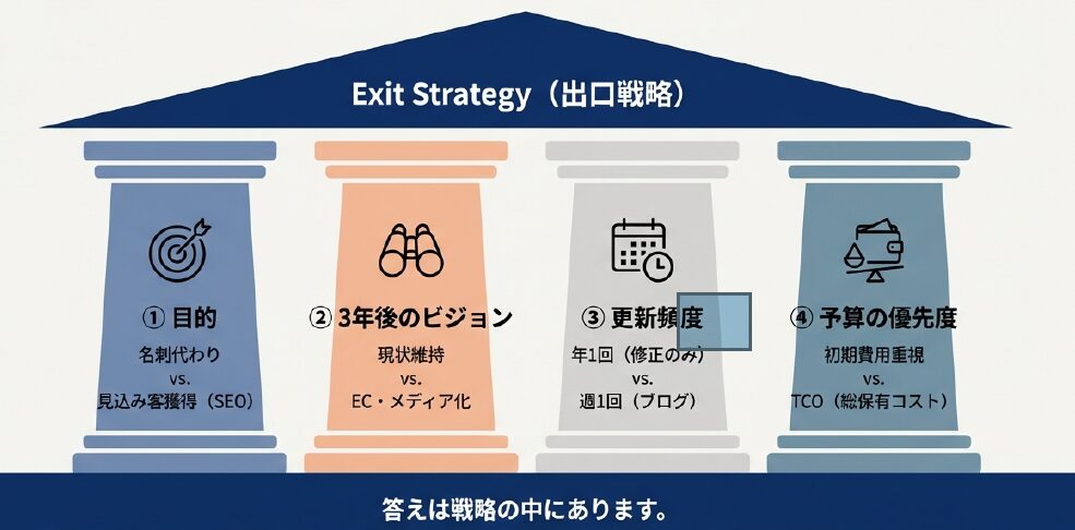 Webサイトは「作って終わり」ではありません。3年後、5年後にどう成長させたいかという「出口戦略」を最初に決めておかないと、後で大きなコストが発生します。