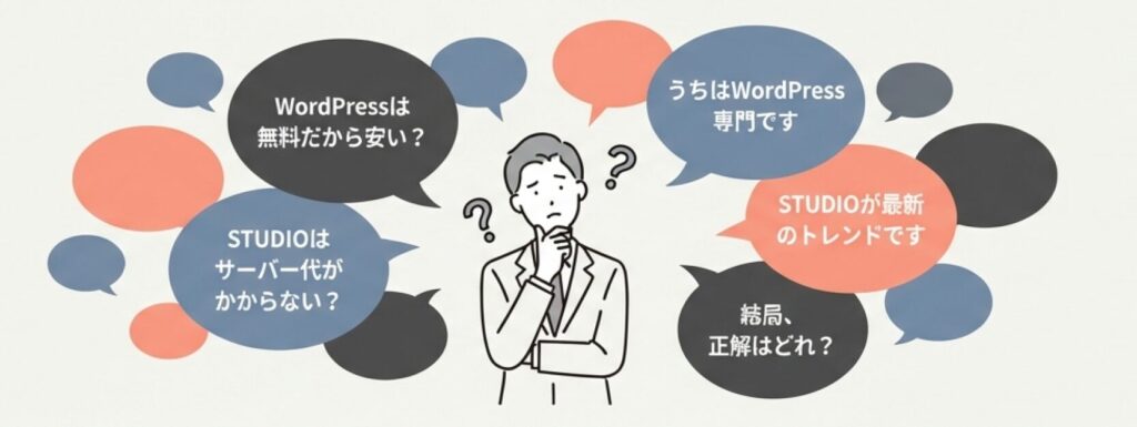 制作会社に相談すると「うちはWordPress専門です」「STUDIOが最新ですよ」と、それぞれが自社の得意ツールを勧めてくる。ネットで調べても「WordPressは自由度が高い」「STUDIOはおしゃれ」といった曖昧な情報ばかり。